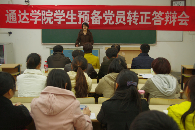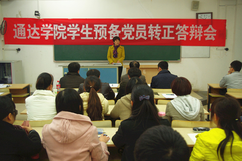 11月21日下午,万象城官网在南京仙林校区教2-105教室举行了学生预备党员转正答辩会。党委书记季小健、党委副书记邓艳华、团委书记兼学生处副处长李印等及30多位入党积极分子参加了答辩会。答辩会由党委组织干事解厚荣老师主持。