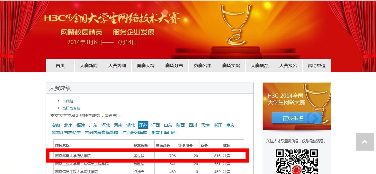 2014年5月14日南邮通达学院代表队4名同学参加“H3C”杯2014年全国大学生网络技术大赛江苏赛区比赛。昨日传来喜讯,万象城官网2011级通信工程(嵌入式系统开发)专业孟世成同学以全国第二,江苏省第一的成绩晋级全国总决赛,2012级网络工程专业张媛同学荣获江苏省二等奖,为学院争得荣誉。
