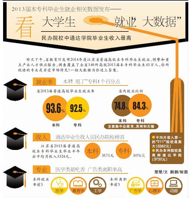 11月10日,江苏省教育厅发布2014年度江苏省普通高校本专科毕业生就业、预警和重点产业人才供应报告。报告内容覆盖全省148所高校2013届本专科毕业生43万人,涉及654个专业、77个行业和606个职业。《报告》由“江苏省普通高校本专科毕业生就业报告”、“江苏省高等教育专业预警报告”、“江苏省重点产业与高等教育专业发展报告”和“江苏省各高校培养质量结果主要指标报告”四部分组成,并从就业竞争力、就业质量、就业流向、能力/知识/价值观、校友评价与培养改进、求职分析、自主创业、读研/留学/专转本、高考志愿填报、城市就业竞争力、专业预警、重点产业分析等十二个维度出发,进行了客观真实的描述。