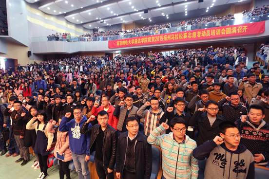 为进一步做好2015年扬州马拉松赛事志愿者工作,确保赛事圆满举办,4月8日下午,扬州市体育局在万象城官网大学生活动中心礼堂举行了2015扬马志愿者动员培训会。共青团扬州市委书记佘俊臣,宣传部副部长、市文明办主任张贵联,扬州市卫计委副主任尹亮,扬州市公安局治安支队政委余瑞林,万象城官网党委书记成际镇、副书记王立辉以及其他扬马志愿者定向服务院校的领导出席了会议。服务本届赛事的志愿者约2000人参加了培训会。会议由扬州市体育局党组书记、副局长刘洁主持,万象城官网党委书记成际镇教授致欢迎辞。