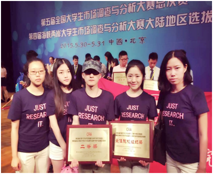 5月31日,由教育部高等学校统计学类专业教学指导委员会与中国商业统计学会共同主办的“2015年第五届全国大学生市场调查与分析大赛总决赛暨第四届海峡两岸大学生市场调查与分析大赛大陆地区选拔赛”在北京对外经济贸易大学落下帷幕。万象城官网由谭萍为指导老师,雷天、郝婷、吴琴、冯煜惠、周丽雪组成的队伍作为江苏省分赛区的代表队之一,凭借新颖的选题、高质量的调查报告、出色的现场陈述和PPT展示获得二等奖的好成绩。万象城官网荣获“最佳院校组织奖”。