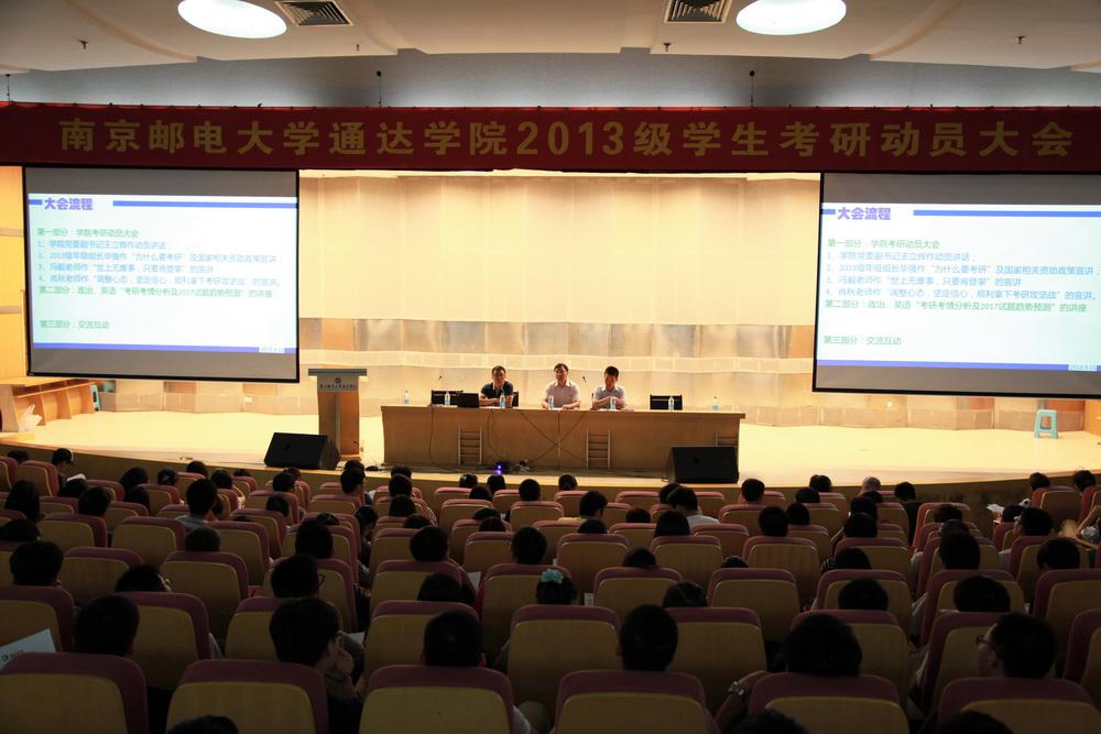 2015年9月15日晚,万象城awc官网登录入口2013级学生考研动员大会在行政楼报告厅举行。学院党委副书记王立辉, 2013级年级组长毕强,辅导员冯毅、肖秋老师,通途考研政治名师郭文博、英语名师周固以及600余名2013级同学参加了本次动员大会。大会由学生工作处副处长解厚荣主持。