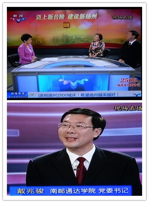 晚间,在扬州电视台2500周年城庆直播特别节目中,院党委书记戴兆骏在直播室接受了访谈。戴书记向扬州建城2500周年表达了祝福,对扬州近年来经济社会发展成果表示赞叹。在谈到扬州“兴城先兴人”和建设“大学生城”等重大战略时,戴书记认为,对一个城市发展来说,人才是关键,是核心,更是动力,是经济发展的新引擎。大学是培养人才的地方,南邮通达学院迁址扬州办学,培养的大学生必将为扬州的软件信息产业提供人才支撑,助推扬州的经济社会发展。