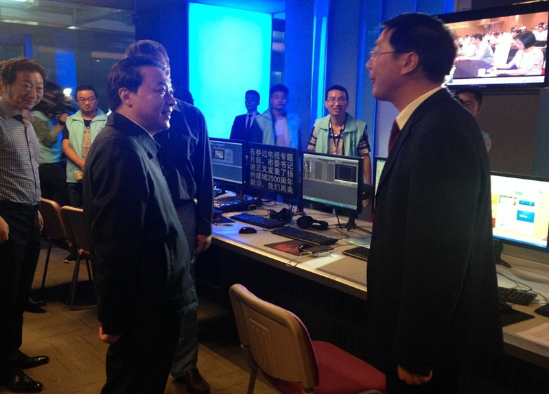 在城庆特别节目直播过程中,扬州市委书记谢正义、市委常委宣传部长卢桂平一行走访慰问了电视台参与直播的工作人员,并与在现场参加节目的戴兆骏书记亲切交谈,表达了对南邮通达学院的关心与支持。