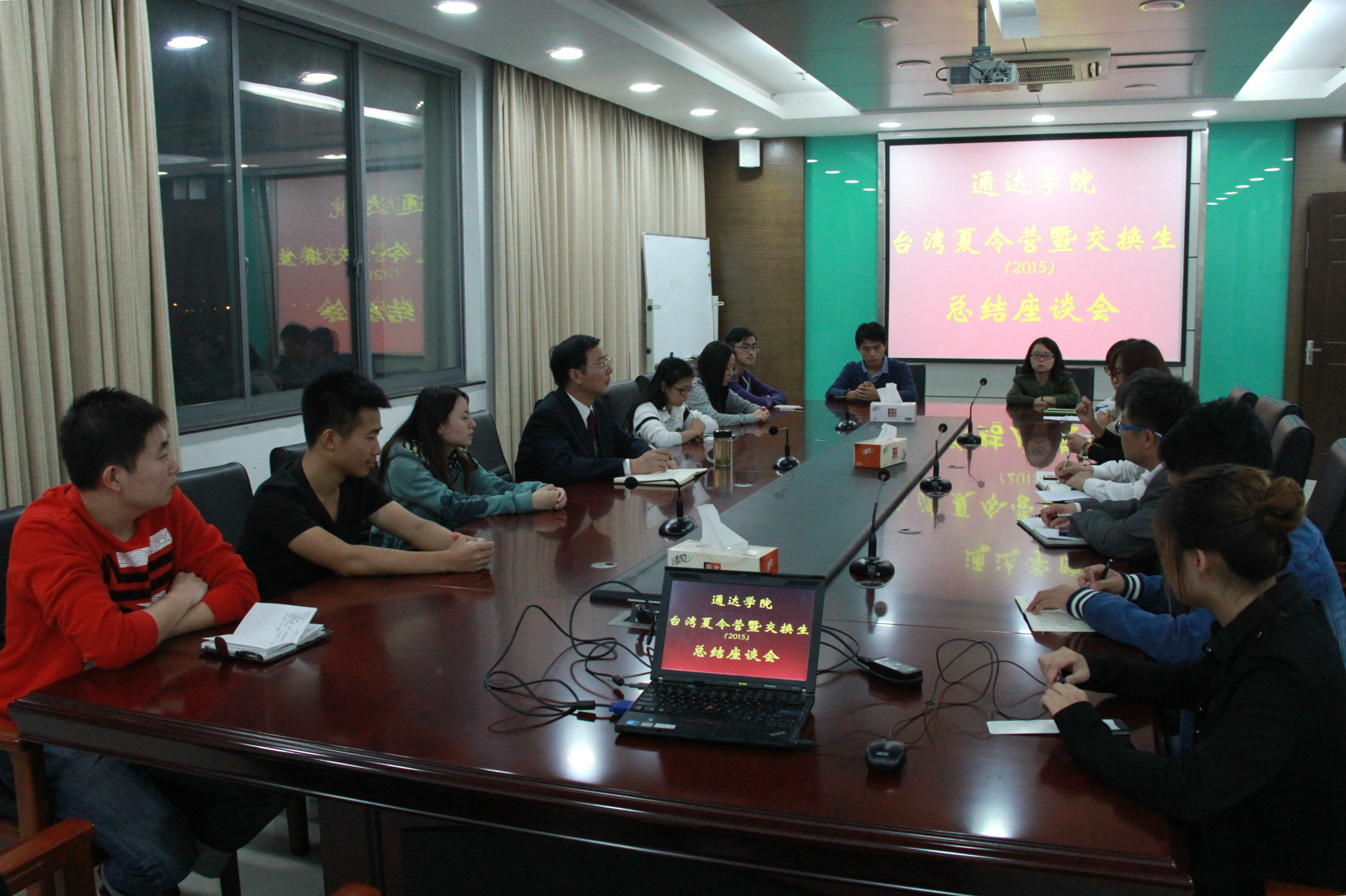 2015年暑假期间,以王志军处长为领队的通达学院师生一行20人,应邀参加了由台湾佛光山文教基金会主办的夏令营活动。座谈会上,参加活动的师生从不同角度畅谈了自己的体会和收获。大家纷纷表示,夏令营为他们提供了一个与来自国内外青年学生交流的平台,增进了青年学生的相互了解和认识、理解与包容。活动加深了他们对台湾社会,尤其是对传统文化所蕴含的丰富深厚的传统道德理念的认识和理解,对提高自己的素养、培育和践行社会主义核心价值观有一定的启示和宣导作用。另外,2015春学期赴台湾佛光大学交换学习的三名学生也介绍了他们的学习和生活情况。