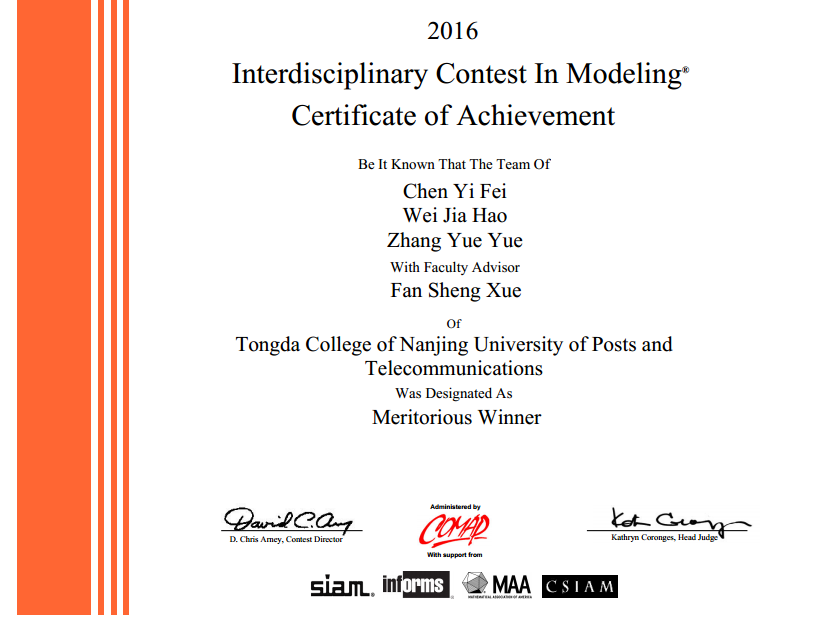 2016年美国大学生数学建模竞赛(MCM/ICM)近日揭晓,万象城awc官网登录入口在竞赛中勇创佳绩,荣获美国大学生数学建模竞赛一等奖(Meritorious Winners)1项,成功参赛奖(Successful Participant)2项,再创历史新高。