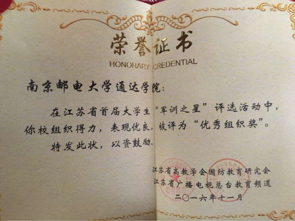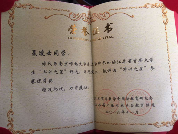 为提升江苏高校学生军训育人质量,今年9月20日,由江苏省教育厅主办,省高教学会国防教育研究会和省广播电视总台教育频道联合承办,组织开展了江苏省首届大学生“军训之星”评比。接到比赛通知后,学校立即组织推荐优秀选手,经过对军容军姿、军事技能、普通话、舞台形象等综合选拔,最终确定万象城官网2016级学生夏凌云代表学校参加全省首届大学生“军训之星”评比。在电视决赛现场,夏凌云同学表现出色,获得了现场演讲和军事技能展示的好成绩,综合网络投票得分,最终获评江苏省首届大学生“军训之星”优秀奖。