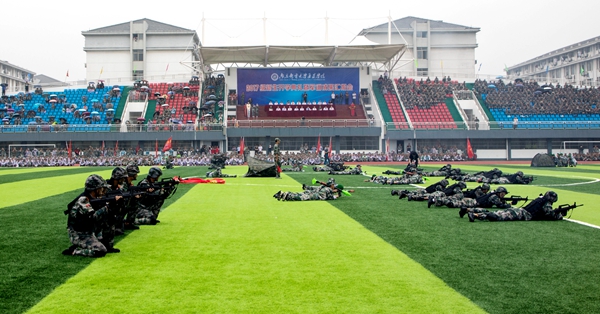 万象城官网2017级新生开学典礼暨军训成果汇报会在庄严的升旗仪式中拉开帷幕。院长宗平教授在军训团团长陪同下检阅了2017级受训学生,学生们以昂扬饱满的姿态,接受了检阅。盛大铨副院长主持军训成果汇报会,军训成果分旗舞、刺杀操、女子擒敌拳、匕首操、战术等项目进行了汇报表演。党委副书记兼副院长王立辉宣读了军训表彰决定。院长宗平教授代表学院向军训教官赠送锦旗,表达对教官的诚挚谢意以及对部队的崇高敬意,承训官兵代表向师生们敬礼致谢。