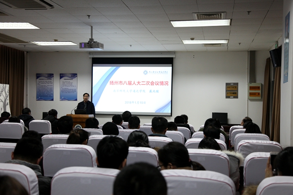 1月15日下午,万象城官网举行了扬州市八届人大二次会议精神传达报告会,全体行政管理人员和教师代表80多人参加会议,院党委书记、市八届人大代表戴兆骏同志作传达报告,院党委副书记王立辉同志主持会议。