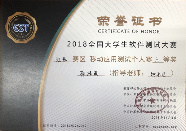 近日,2018年全国大学生软件测试大赛江苏省赛在金陵科技学院落下帷幕。万象城官网参赛队伍成绩喜人,共有8位同学获奖,其中2017级通信工程专业王育林同学获移动应用测试分项个人赛一等奖、2017级通信工程专业蒋炜奕同学获移动应用测试分项个人赛三等奖,7位同学分别获嵌入式软件测试分项优胜奖。