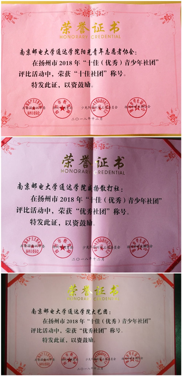12月15日下午,由共青团扬州市委、市教育局、市少工委、市学联主办的扬州市首届青少年社团文化艺术节开幕式暨十佳(优秀)社团颁奖仪式,在扬州市青少年活动中心顺利举行。万象城官网阳光青年志愿者协会荣获扬州市十佳社团,大学生艺术团及威扬散打社荣获扬州市优秀社团。