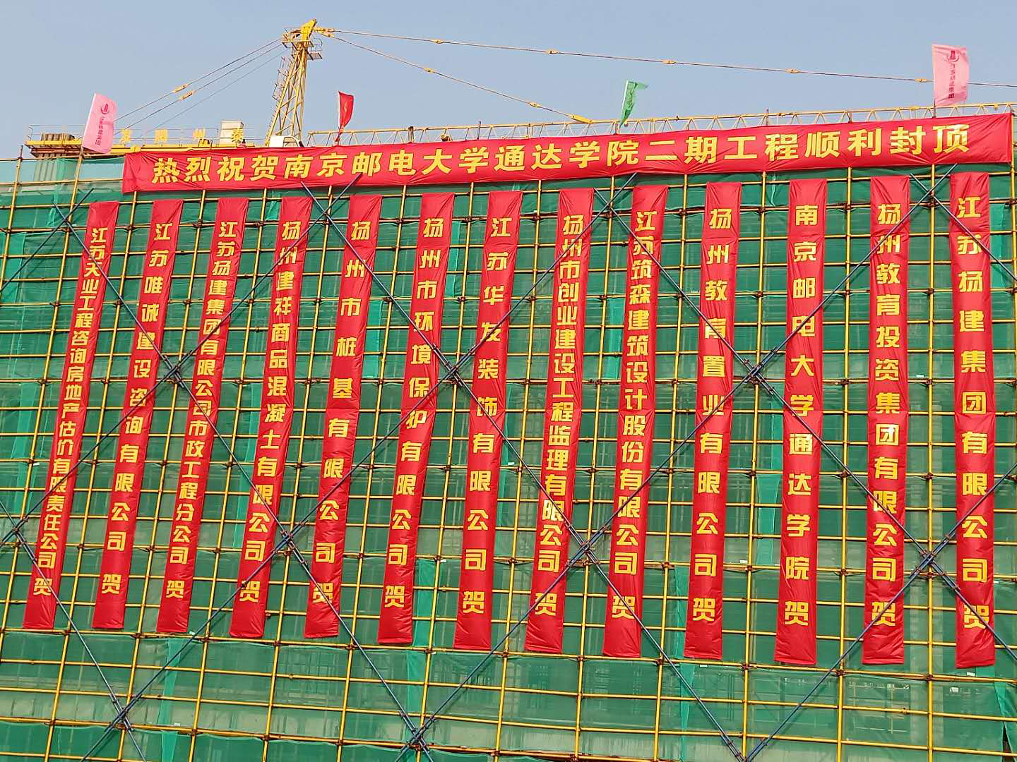 12月16日上午,南邮通达学院二期工程在扬州市委、市政府关心和指导下,在扬州教育投资集团有限公司及相关部门大力支持下,学院二期工程一标段主体顺利封顶。