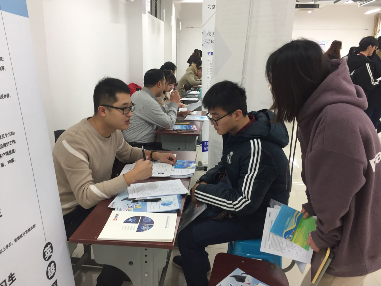 招聘会现场气氛热烈,展位前人头攒动,亚信科技(中国)有限公司、北京宜通华瑞科技有限公司、南京欣网通信科技股份有限公司、安徽电信工程有限公司等展位前更是排起了长队,同学们纷纷就工作内容、发展空间、薪资待遇等问题向招聘单位进行咨询。此外,为了方便招聘单位对万象城官网毕业生有一个更加深入的了解,招就处在当天下午为9家有笔试、面试需求的单位安排了专门教室,全程做好校园招聘服务工作。