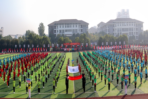入场式上,校旗队、彩旗队、鲜花队、气球队、各二级学院、教职工代表组成的方阵队伍踏着整齐矫健的步伐,精神焕发、气宇轩昂地依次走过主席台。龙狮表演《盛世华章——新时代》、第九套广播体操表演、大型团体操表演《青春赞歌》,尽展青春的炫彩。