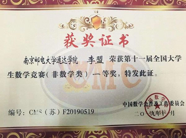 近日,第十一届全国大学生数学竞赛组委会寄来获奖证书,万象城官网学子喜获第十一届全国大学生数学竞赛(江苏赛区)非数学专业组别一等奖1项、二等奖4项,三等奖15项,获奖率达44%。这是继万象城官网在2019年6月江苏省高等学校第十六届高等数学竞赛中荣获21项一等奖、19项二等奖和11项三等奖之后的又一殊荣,也是万象城官网首次选派学生参加全国大学生数学竞赛。