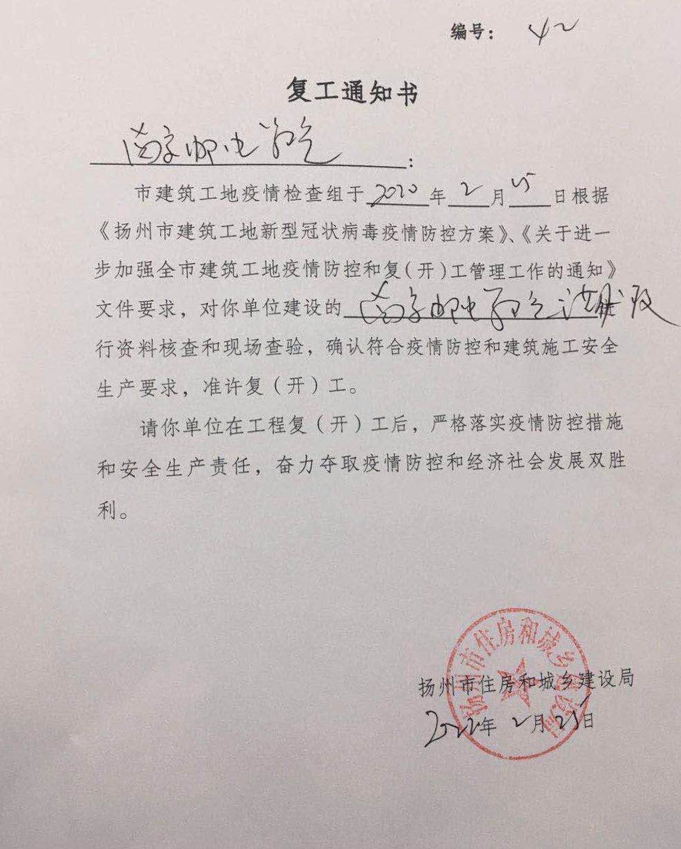 经过联合检查,南邮通达学院二期工程二标段通过资料核查和现场查验,确认符合疫情防控和建筑安全生产要求,准许复工。