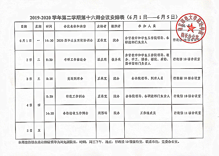 2019-2020学年第二学期第十六周会议安排表