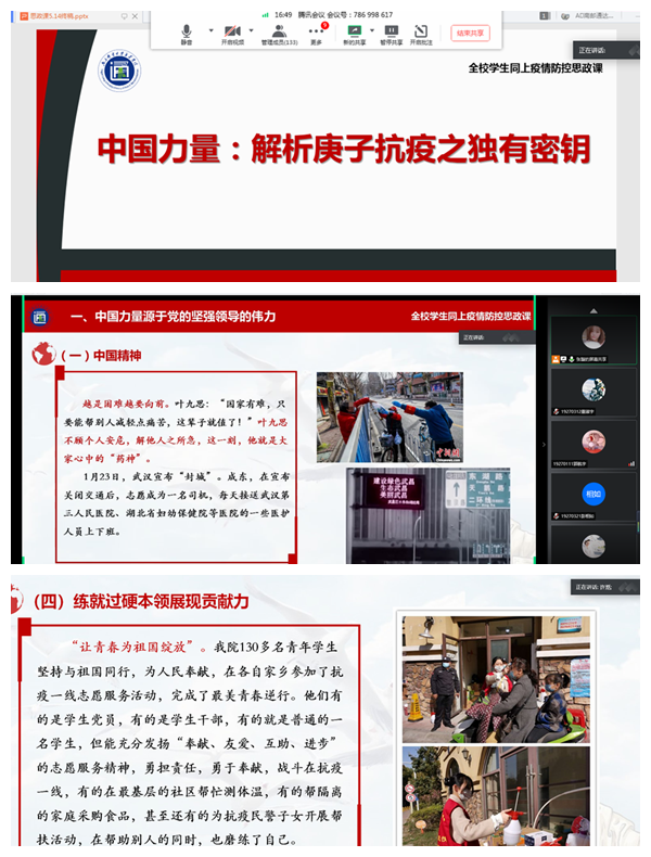 5月27日晚,学院面向全体学生同上了题为《中国力量:解析庚子抗疫之独有密钥》疫情防控线上思政课,近万名学生线上参与了学习。