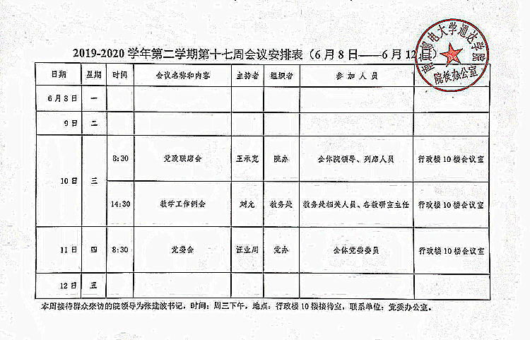2019-2020学年第二学期第十七周会议安排表