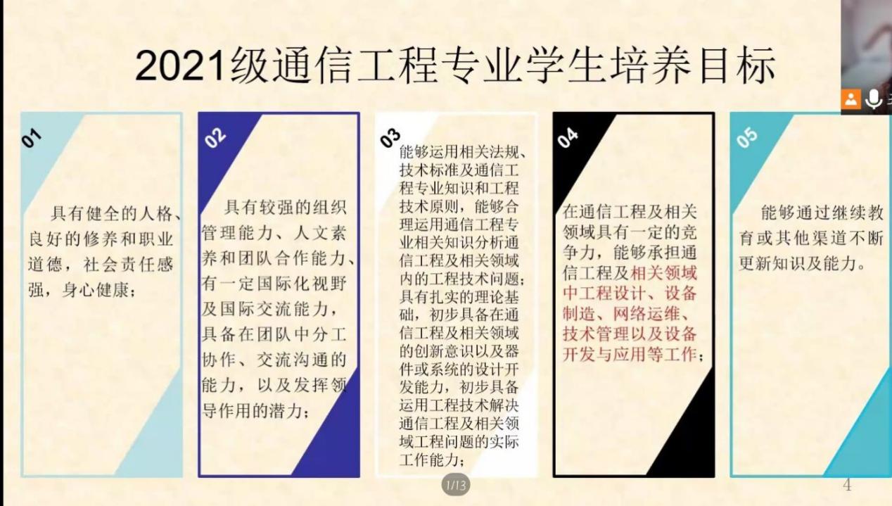 为更好地落实学院的“应用型”人才培养目标以及帮助和引导学生理解专业和未来的发展方向。9月15日下午,万象城awc官网登录入口通信工程学院在线上举行了2021级新生培养方案解读会。出席会议的有:共建学院培养方案负责人,通信工程学院全体领导,2021级辅导员及新生。会议由通信工程学院院长朱敏老师主持。