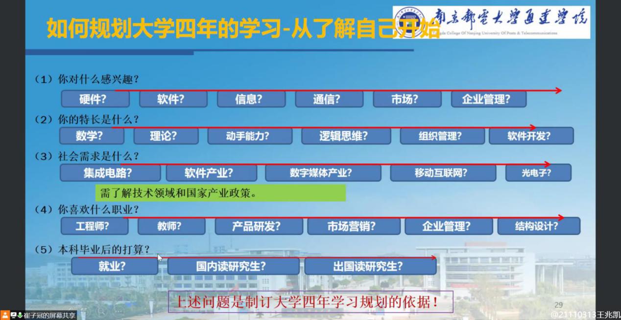 培养方案负责人从培养目标、毕业要求、主干学科和交叉学科、核心课程、毕业学分及比例要求,通信工程(嵌入式培养)、信息工程专业的专业课程体系配置等方面对培养方案进行了详细的解读。同时也对上述专业找工作以及考研的相关情况进行了详细的介绍,让学生对未来四年的学习目标和任务有了初步的了解和认识。此外,培养方案负责人还对新生在大学的学习、生活方面的转变做出了说明,并且对学生未来四年的规划提出了建议。