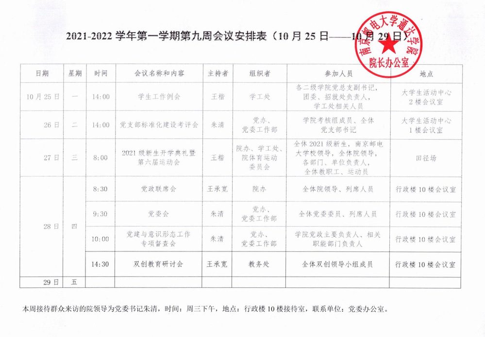 2021-2022学年第一学期第九周会议安排表