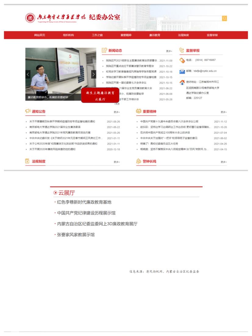云端展厅送“廉洁清风”。因疫情防控需要,学院纪委借助门户网站开通云端展厅,包含纪律建设历程、家风家教展示、新时代廉政教育等主要内容。裸眼3D“云逛”、在线讲解“云听”等多种新媒体呈现方式,大大提升了廉洁教育的实效性和互动性。