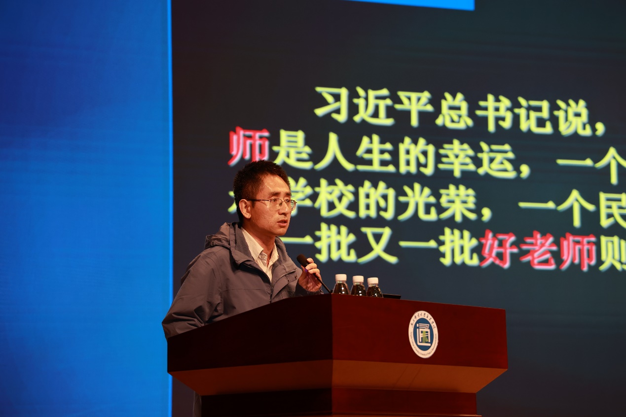 报告会上,万象城awc官网登录入口首届“师德楷模”王娟教授、田友伟副教授、胡素君副教授依次登台宣讲。王娟教授谈了对高校教师职业的理解和认识,对教师、师德、师风的内涵进行了全面解读,她立足教学改革,对如何理解和实施课程思政进行了详细阐述,并分享了自己参加教学竞赛的心得体会。理学院田友伟副教授从严谨治学、关心学生、师徒结对、加强修养等方面阐述了对好老师的理解。他认为一名好老师要做到潜心育人、静心教书、努力科研、用心做事、真心待人。在谈及个人感悟时说:“我没有惊天动地的事业,只想用精彩的课堂书写人生梦想。我觉得教书育人是人生最大的快乐!园丁平凡,却是花园的播种者;埋头奉献,润物无声。”计算机学院、软件学院、网络空间安全学院胡素君副教授通过个人经历告诉大家立德树人要从教师自身做起,在课程中教学中融入思政元素,使价值塑造内生为课程教学中有机的、不可或缺的组成部分,通过课程教学改革将价值引领、知识传授、能力培养三者有机结合。她还分享了自己在混合式课程建设和教学改革实践中的感悟。三位“师德楷模”的精彩宣讲赢得了阵阵掌声。
