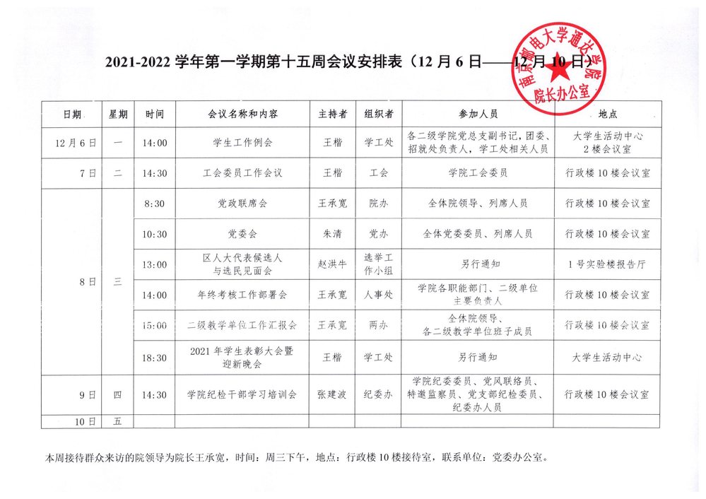 2021-2022学年第一学期第十五周会议安排表