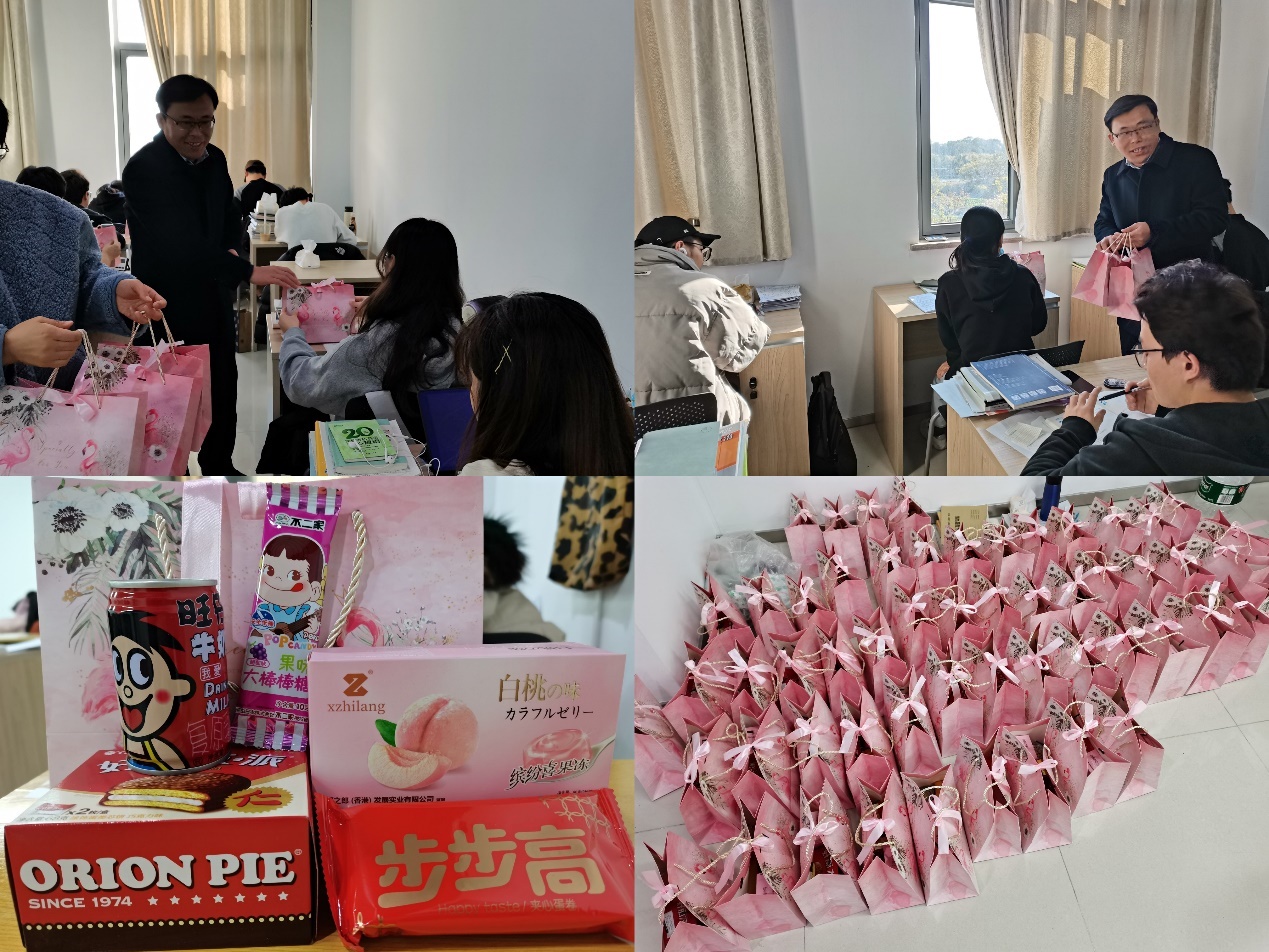 各部门组织的慰问活动也是形式多样:学工处和各二级学院为考研同学们精心准备了大礼包,除考研书袋、考试文具、学弟学妹们手绘的祝福贺卡和明信片外,电气工程学院还准备了柿子和橙子,象征“心想‘柿’‘橙’”;电子工程学院和计算机工程学院准备了糕点,象征“一举‘糕’中”;商学院准备了抱枕和特制的祝福语可乐;通信工程学院准备了“孔庙祈福”考试专用文具套装。同学们收到礼物和祝福都十分感动,表示愿将这份温暖和鼓励化作奋力拼搏的动力,以优异的成绩回馈母校四年的教诲。