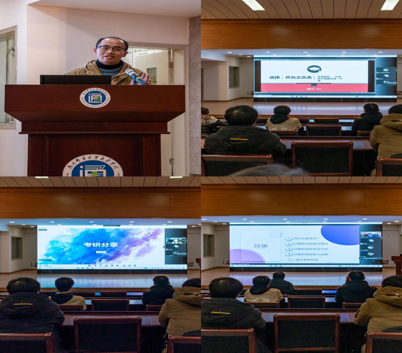 接着,江苏科技大学计算机学院院长高尚就“为什么要考研”,结合当前就业形势与考研对未来发展带来的机遇,全面分析考研的必要性和重要性,鼓励同学们要有必胜的信心,志存高远,以积极乐观的态度面对考研。高院长还介绍了江苏科技大学计算机学院研究生招生政策、招生目录、初试概况、近年考研报名与录取情况以及研究生教育情况进行了详细的讲解,欢迎同学们报考江苏科技大学。
