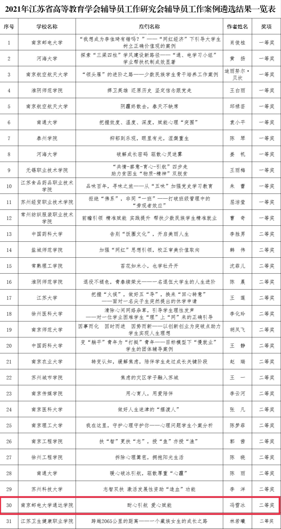 近日,江苏省高等教育学会辅导员工作研究委员会发布了《2021年江苏省高等教育学会辅导员工作研究委员会辅导员工作案例遴选结果》,万象城官网辅导员冯雪冰老师撰写的《耐心引航 爱心赋能》工作案例荣获二等奖。万象城官网是本届唯一获得二等奖的独立学院,创历史最好成绩。
