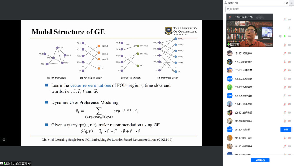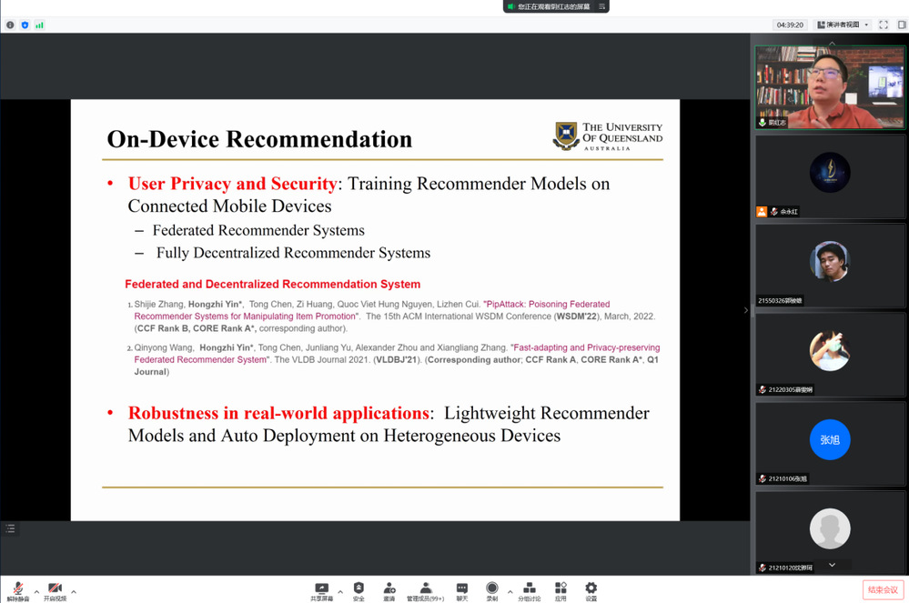 报告中,阴教授以地理社交网络应用为引入,介绍了地理社交推荐服务的应用价值、发展前景和技术路线。针对当前地理社交推荐所面临的主要挑战,分享了其研究团队所提出的三种新型地理社交推荐范式:面向个人用户的兴趣点推荐、面向动态群组的兴趣点推荐以及兴趣点-伙伴组合推荐。另外,就地理社交推荐的鲁棒性和安全性问题,对新型的移动推荐系统架构进行了分析和展望。报告最后,阴教授与师生进行了友好互动并回答了大家所提出的问题。整场报告主题新颖、内容前沿,阴教授的讲解深入浅出、启发性强,受到与会师生的欢迎与好评。