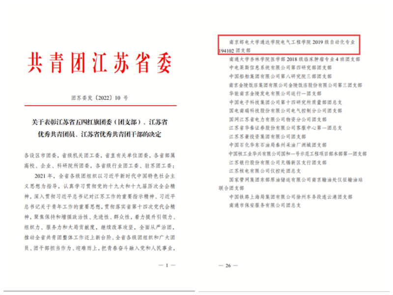 近日,共青团江苏省委下发《关于表彰江苏省五四红旗团委(团支部)、江苏省优秀共青团员、江苏省优秀共青团干部的决定》,万象城官网194102团支部荣获“江苏省五四红旗团支部”称号,这也是万象城官网团支部首次获得该殊荣。“江苏省五四红旗团支部”是共青团江苏省委授予基层团组织的最高荣誉,本年度全省共有5个独立学院团支部获评此奖项。