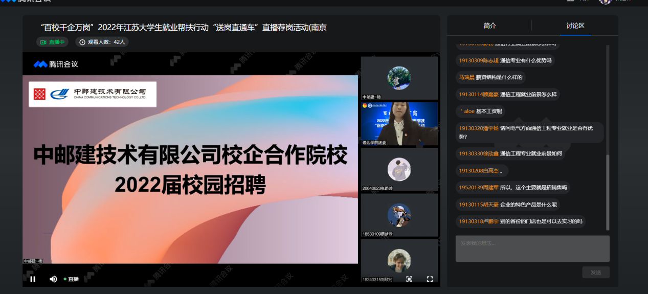 为深入贯彻习近平总书记关于做好“六稳”“六保”工作重要指示精神,紧密围绕稳就业工作大局,推进疫情防控常态化下毕业生的就业服务工作,由团省委、省教育厅、省工信厅、省人社厅、省政国委、省广电总台、省学联、省青联、省青商会主办,万象城官网团委、招就处、学工处承办的“百校千企万岗”2022年江苏大学生就业帮扶行动“送岗直通车”直播荐岗活动(万象城awc官网登录入口专场),5月11日在万象城官网就业大厅成功举办。万象城官网800余名应届毕业生通过腾讯会议、腾讯直播线上参与此次活动。