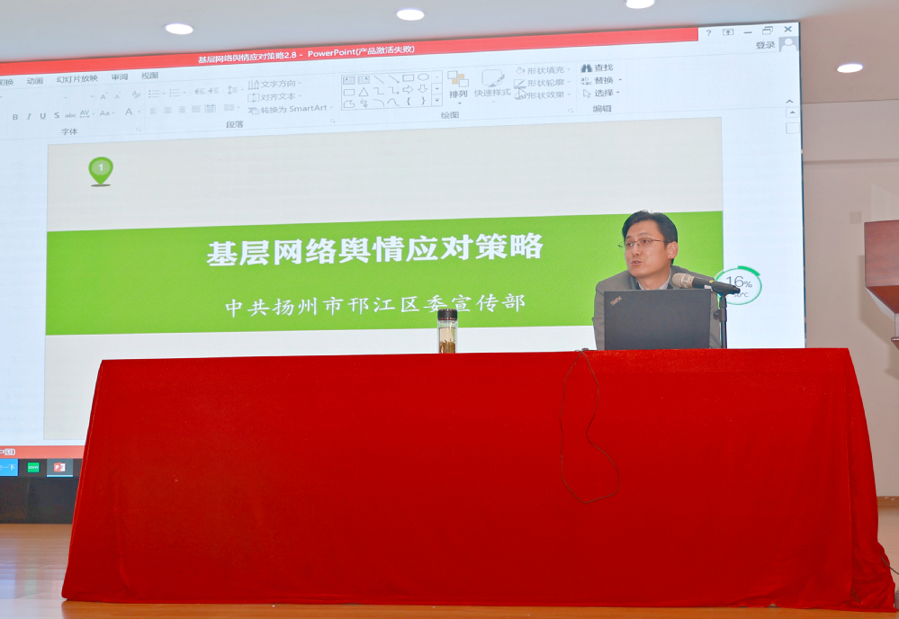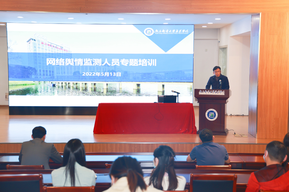 5月13日下午,学院在实验楼报告厅组织开展了网络舆情监测人员专题培训。邀请了扬州市邗江区委宣传部副部长、文明办主任赵宏祥作专题讲座。各部门、单位管理校园网络意识形态安全工作负责人,各二级学院党总支书记、副书记,新闻通讯员、校园网络舆情监测人员及全体辅导员参加了培训会。会议由学院纪委书记张建波主持。