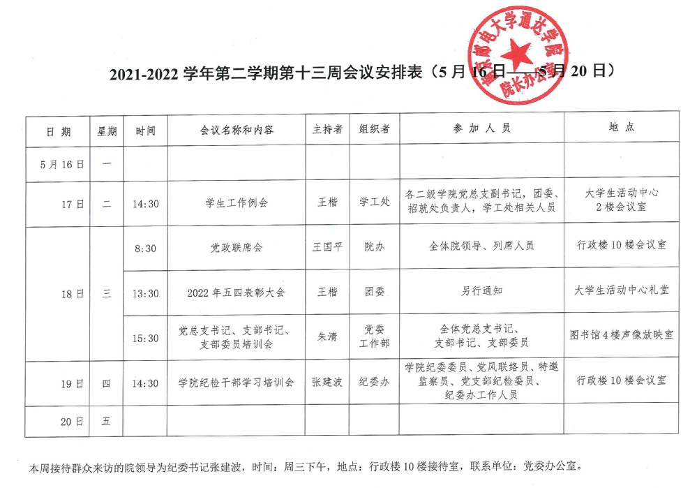 2021-2022学年第二学期第十三周会议安排表