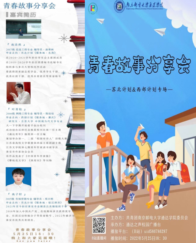 5月25日晚,由院团委主办、通达之声校园广播台承办的青春故事分享会(苏北计划&西部计划专场)在团委哔哩哔哩账号进行直播。