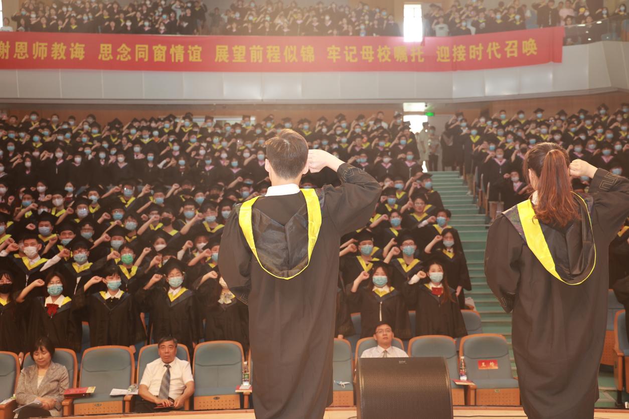 依依不舍离母校,扬帆起航踏征程。毕业典礼上,教师代表闫志龙深情回忆了同学们在校的点点滴滴,希望同学们记得常回家看看,继续与老师分享未来的喜悦与懊恼。线下学生代表郝荣发言,她深情地诉说着大学四年对母校、对恩师、对父母、对同窗的感恩之情,表示今后身处时代洪流,仍听从内心召唤,永远做一个豪情满怀,心似火焰的有梦少年。线上学生代表王澄盈、张祥泽、兰心怡、张敏洋、李铄玙、刘淑琳也通过“云端”视频表达了他们对母校的感恩之情,祝愿母校越来越好,同时祝福同学们一路通达。宿舍管理员代表王格平用朴实无华的语言分享了四年中同学们的成长和蜕变,希望同学们能在最好的年华,做最好的自己。