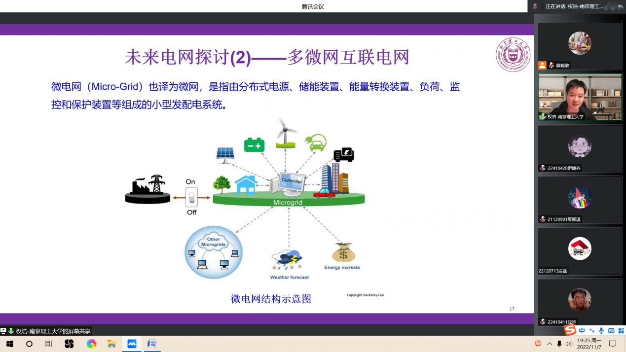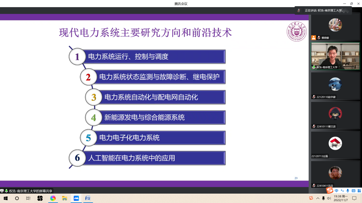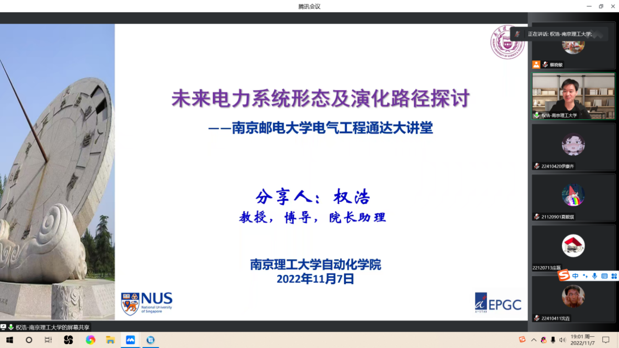 11月7日晚19点,由教务处主办,电气工程学院承办的通达大讲堂开讲。南京理工大学自动化学院权浩教授应邀作题为《未来电力系统形态及演化路径探讨》的学术报告。