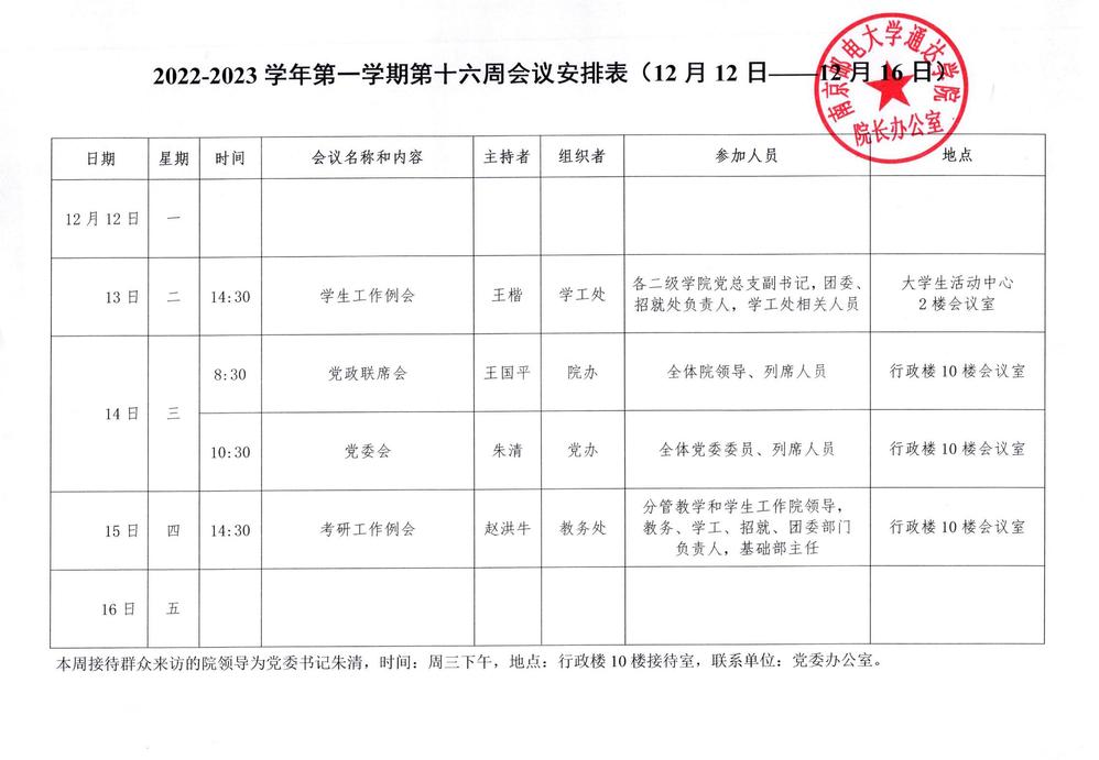 2022-2023学年第一学期第十六周会议安排表