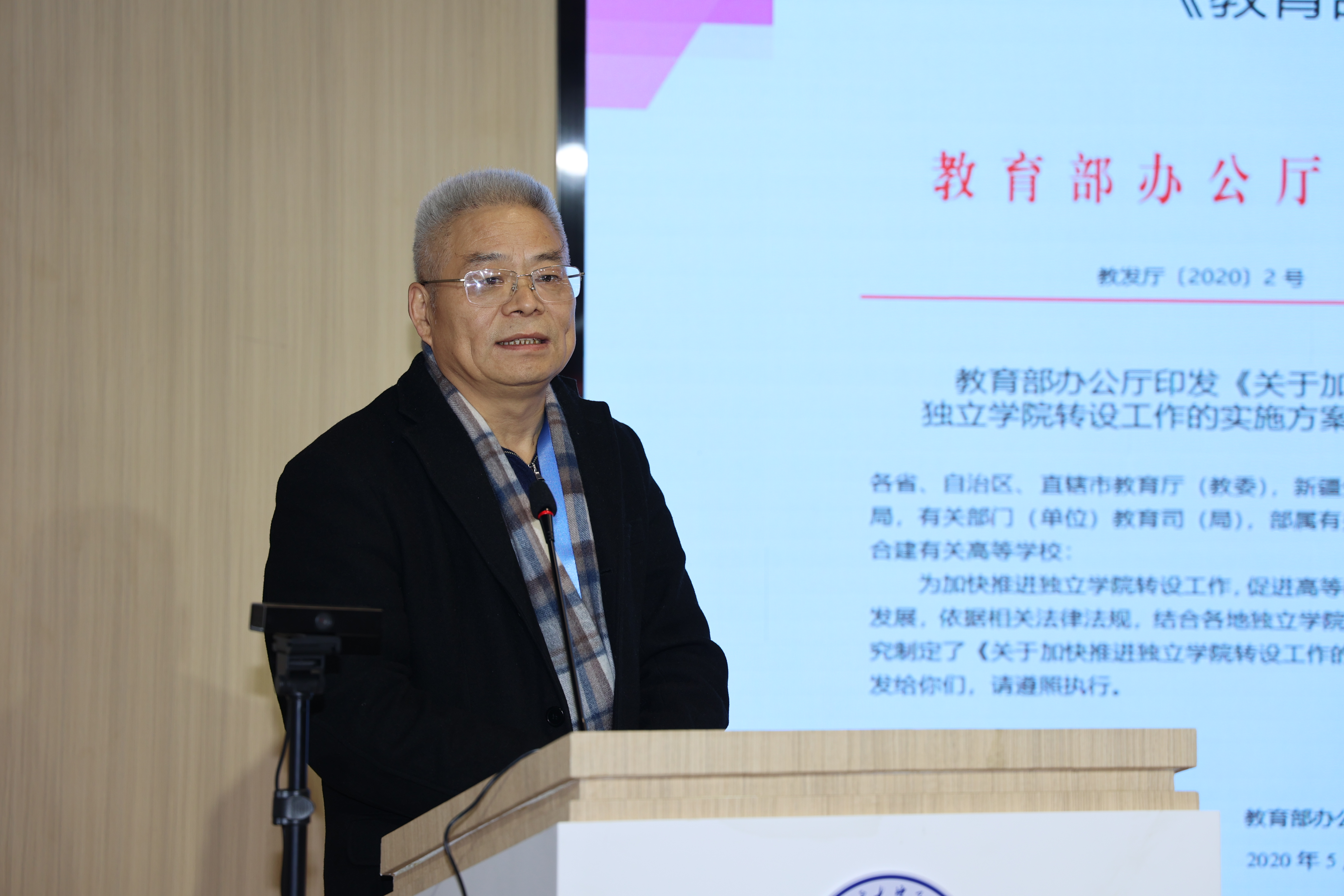 原江苏省教育厅副厅长、江苏省高等教育协会会长丁晓昌在线上发表了讲话。首先,他对研讨会的成功举行表示热烈的祝贺,对长期以来关心、支持江苏独立学院发展的各位领导和专家学者表示衷心的感谢。他指出,正值全国上下深入学习贯彻二十大会议精神之际,此次研讨会的召开恰逢其时,为总结独立学院教育改革发展经验,谋划未来独立学院发展战略,提供了一个集思广益、凝心聚智的平台。他在讲话中强调,独立学院是我国高等教育的重要组成部分,是教育事业发展的重要增长点和促进教育改革的重要力量。经过多年的努力,江苏省独立学院蓬勃发展,为国家经济社会发展做出了不可磨灭的贡献。丁会长通过回顾独立学院的发展历程,介绍了独立学院转设的基本要求,围绕独立学院高质量发展、人才培养、办学体制机制等多个层面介绍了独立学院发展的必要性、必然性、紧迫性、挑战性,诠释了独立学院人才培养的基本路径、重点、难点。他希望通过研讨交流深入总结各自在办学治校、内涵建设、质量提升等方面的成果和经验,充分交流各自办学心得体会,达到共享共进的良好效果。