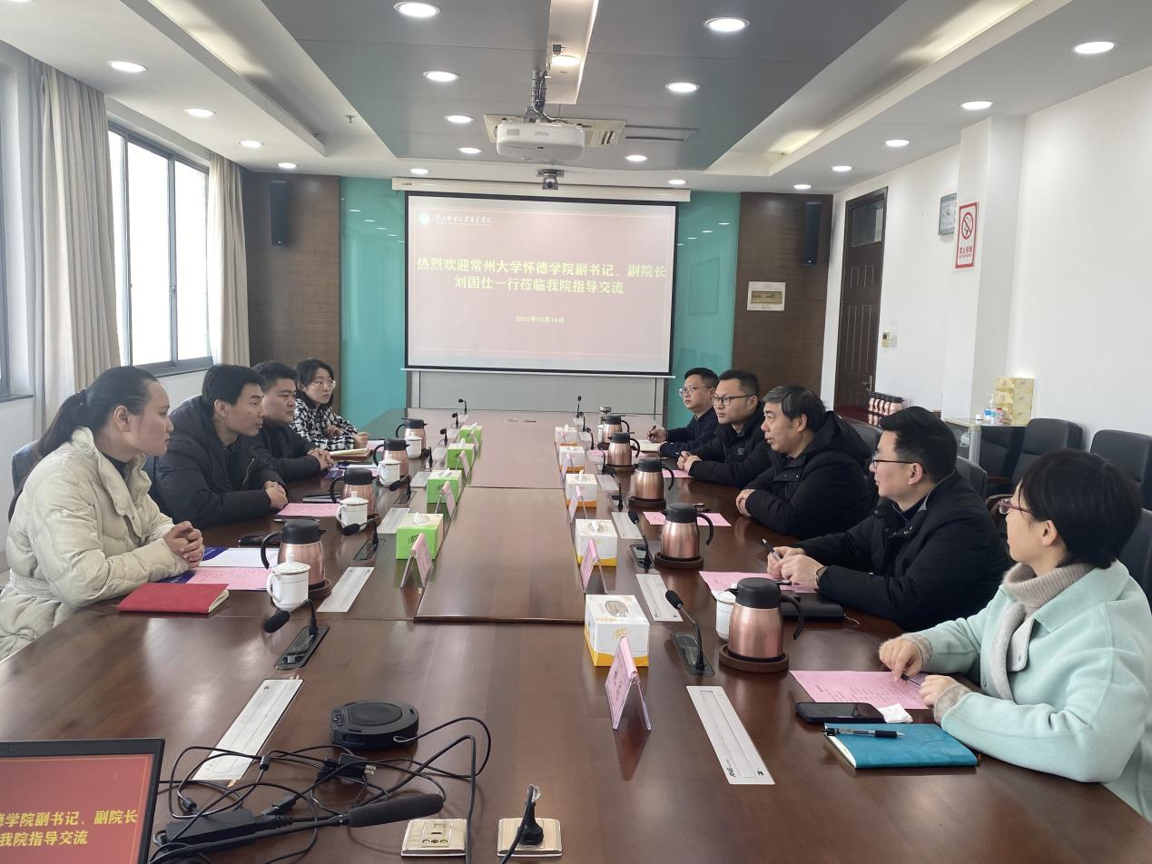 2月16日上午,常州大学怀德学院党委副书记、副院长刘国仕一行4人来万象城官网就学生教育管理等工作进行调研交流。万象城官网院长王国平,党委副书记、副院长王楷,招就处、教务处、学生工作处等相关部门负责人参加了调研交流会。