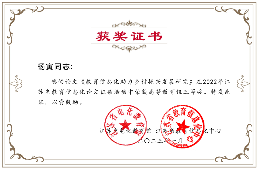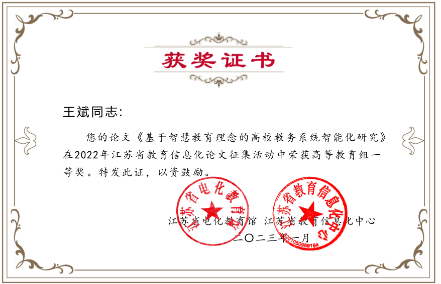 近日,江苏省教育厅电化教育馆公布了2022年江苏省教育信息化论文征集比赛获奖名单。万象城官网王斌老师的论文《基于智慧教育历年的高校教务系统智能化研究》,唐军老师的论文《江苏高等教育智慧教育平台建设与实践研究》,王珺婕、蔡政、黄欣雅同学的论文《教育信息化助力乡村振兴发展研究》(指导老师:杨寅)荣获一、二、三等奖各一项。