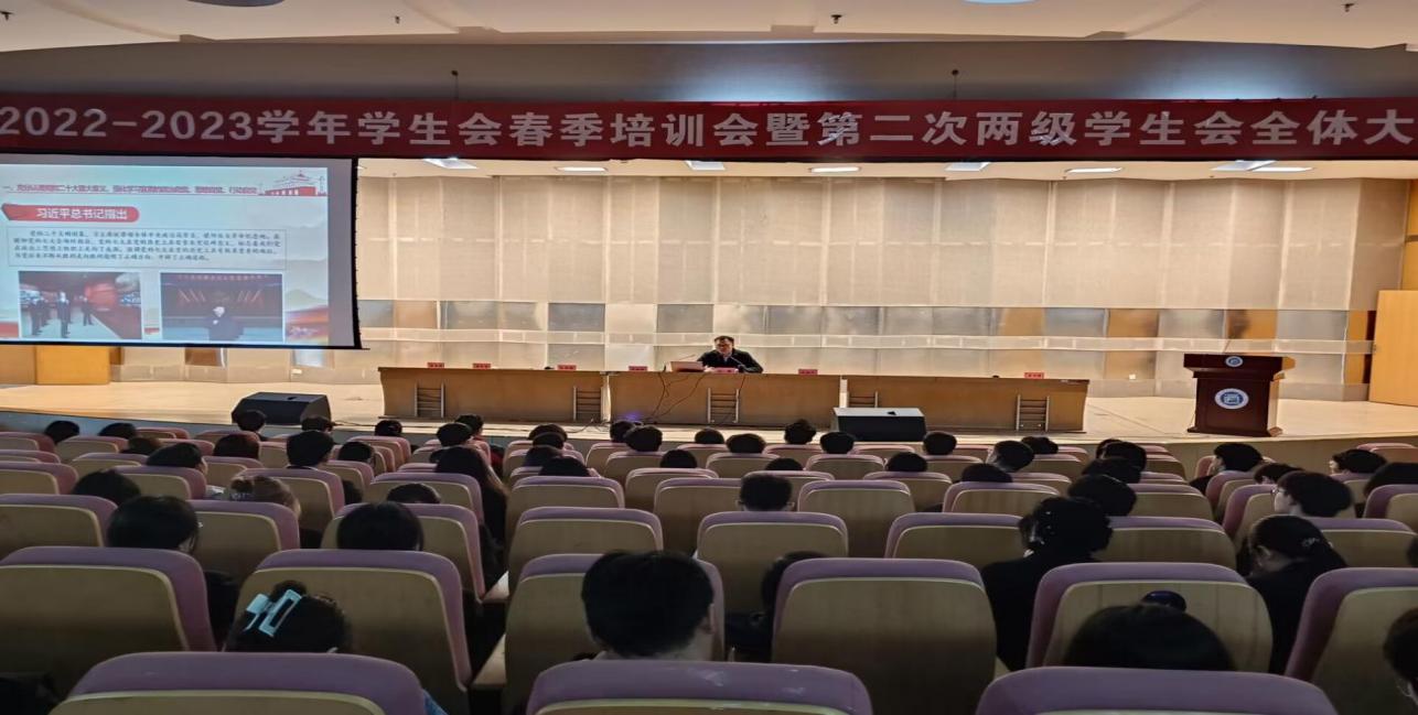 3月29日中午,万象城官网学生会在行政楼报告厅开展了“以党的二十大精神为统领,奋力谱写新时代青春华章”为主题的宣讲活动。学院党委副书记兼副院长王楷主讲,学院团委负责人以及两级学生会全体成员共100余人参加宣讲会。