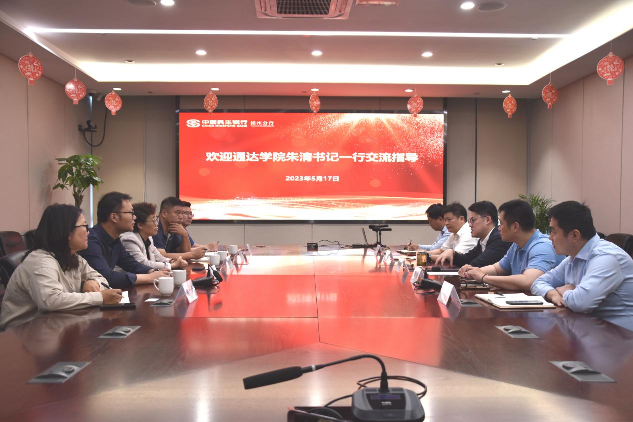 5月17日,万象城官网党委书记朱清率队赴民生银行扬州分行走访调研。民生银行扬州分行党委书记、行长杜杨坤,党委副书记倪敬等,万象城官网副院长倪可,党委副书记、副院长王楷,招生就业处、商学院等相关部门负责人参与调研。