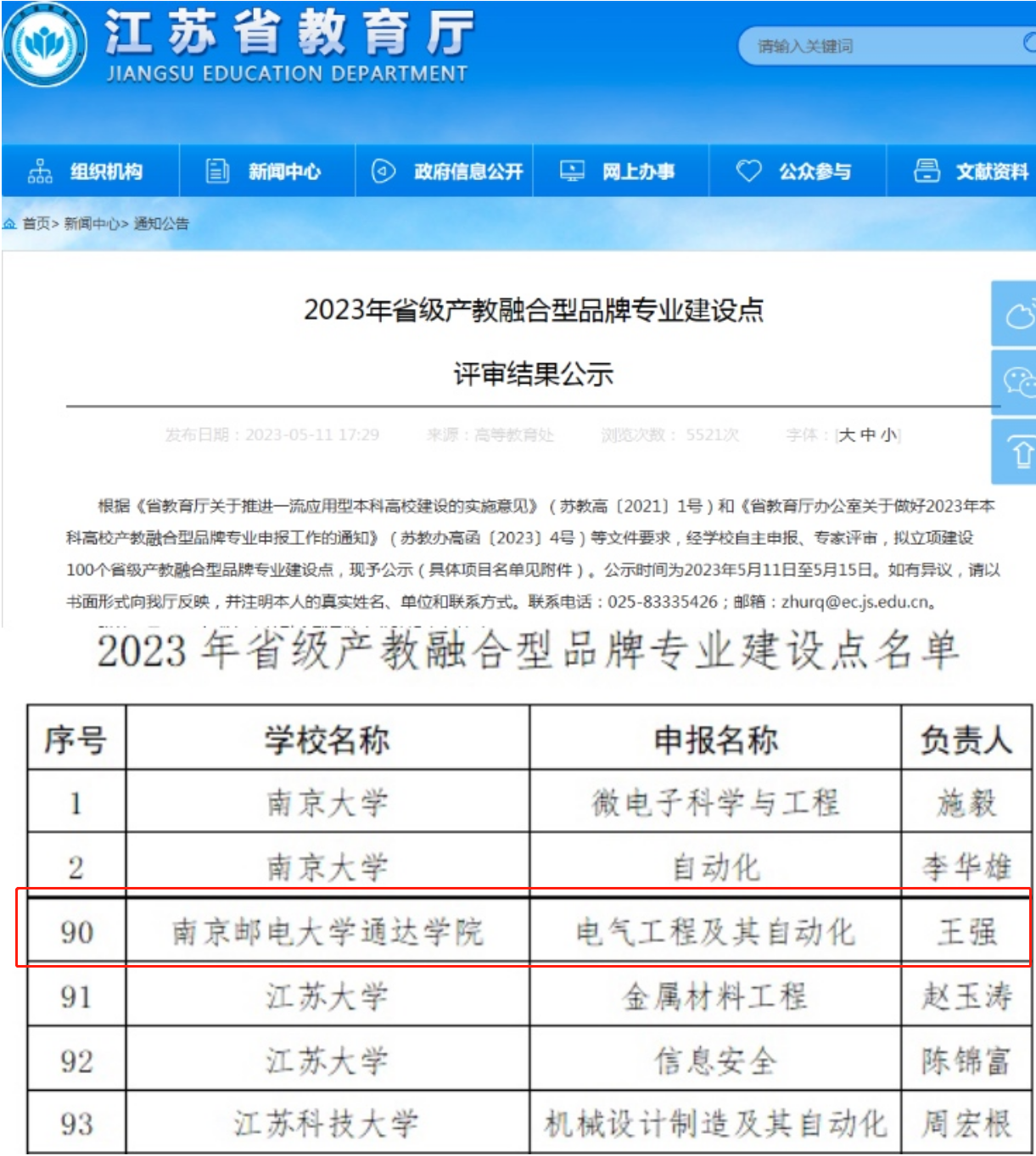 近日,省教育厅发布《2023年省级产教融合型品牌专业建设点评审结果公示》,万象城官网电气工程及其自动化专业获批2023年江苏省产教融合型品牌专业建设点。万象城官网是获批专业数量第一、并且唯一连续两年获批的独立学院。