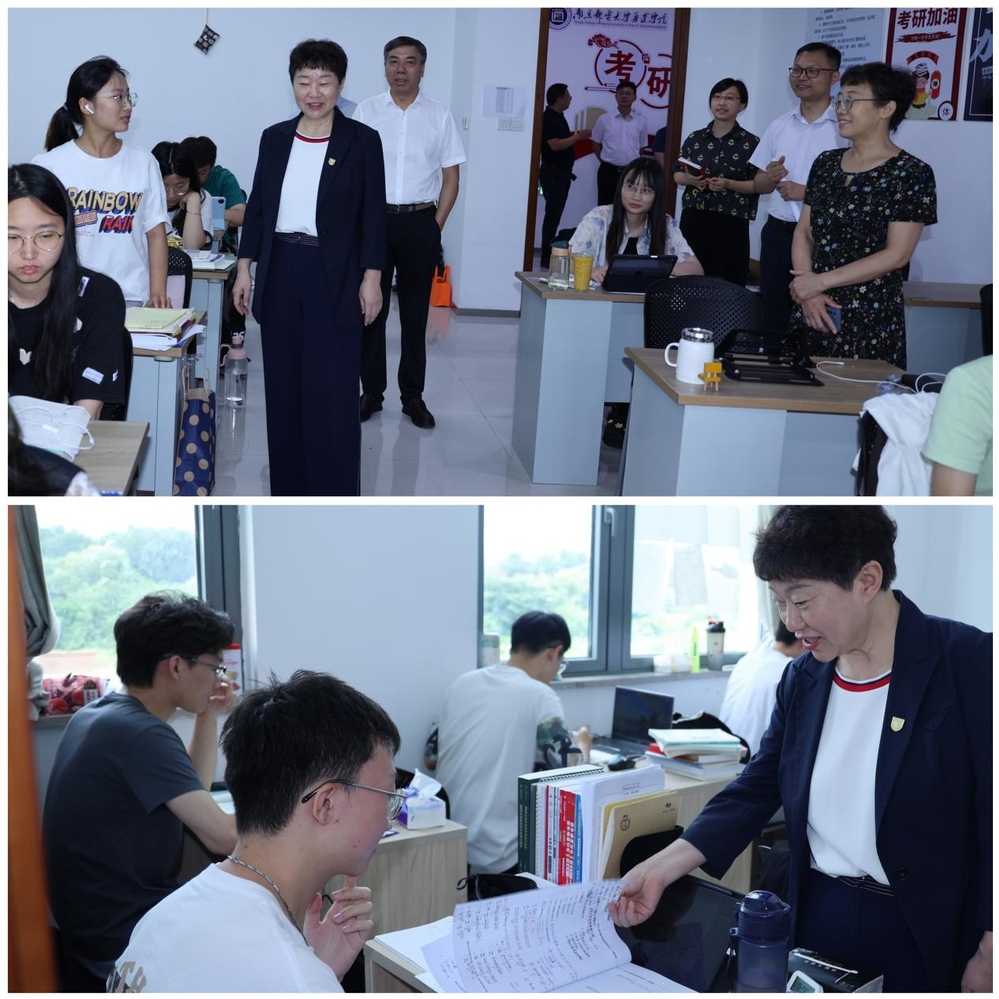 慰问现场,叶美兰理事长向考研学子们表达了鼓励和期望,嘱咐大家在备考阶段注意劳逸结合,勉励同学们坚守考研初心,坚持考研梦想,要充分利用暑期时间为实现考研目标努力拼搏。学院领导们与同学们就拟攻读学校、复习进程、遇到的困难等方面进行了深入交流,并为同学们送上了精心准备的慰问品,表达全院师生的美好祝福。