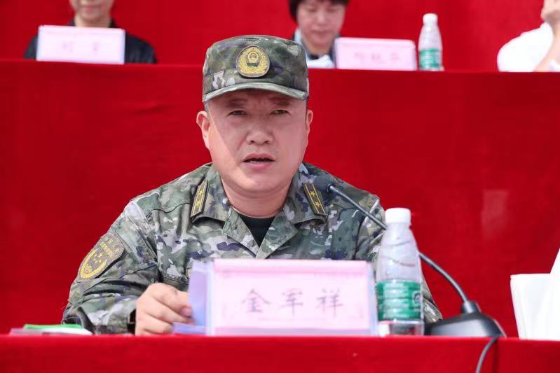 武警扬州支队副支队长金军祥在讲话中期盼2023级新生能够在军训过程中,不畏艰难险阻、坚持不懈、勇往直前。