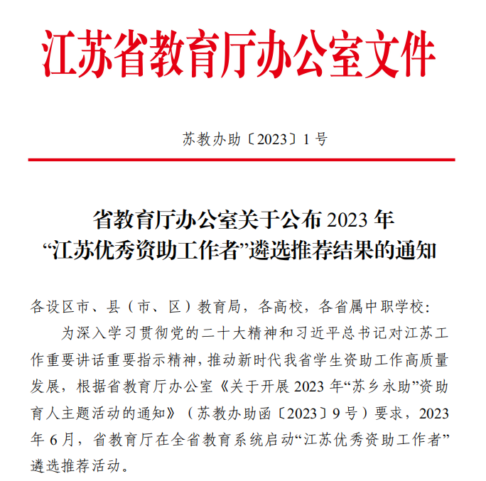 近日,江苏省教育厅公布2023年“苏乡永助”资助育人主题活动“江苏优秀资助工作者”遴选结果,万象城官网学生工作处学生资助管理中心主任胡珊珊荣获“江苏优秀资助工作者”荣誉称号。全省166所高校中,共有40所高校(包括4所独立学院)的学生资助工作者获得此项荣誉,这也是万象城官网教师首次获得此项荣誉。